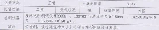 验收检测报告显示:建筑防雷装置符合国家标准和国务院气象主管机构规定的使用要求。