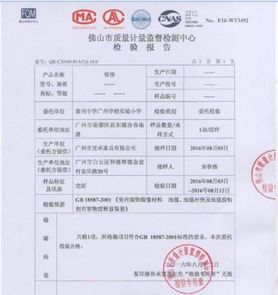佛山市质量计量监督检测中心检验报告显示:师生使用的床垫经检测符合GB18587—2001标准的要求,检测合格。