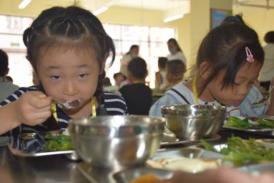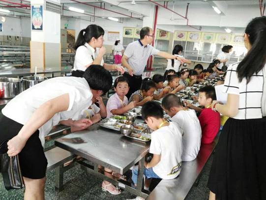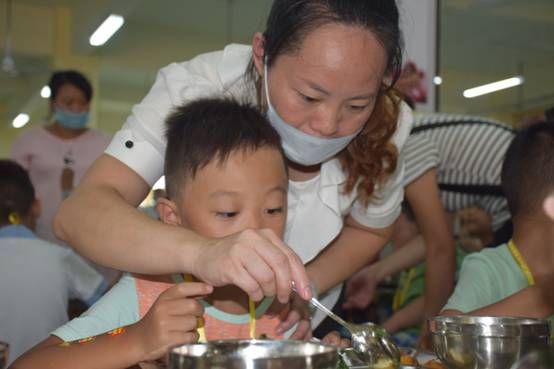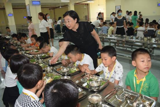 黄莉副校长和老师一起,细心关注每一个孩子用餐情况。