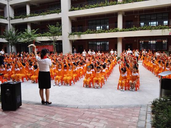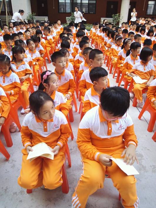 紧接着,德育处谭英主任在队旗下给预备队员介绍“少先队员”这个神圣的称谓。孩子们用心地学习了有关队的知识、敬队礼、宣誓时的手势,以及如何争章入队。孩子们坐姿端正,侧耳倾听,专著的眼神表达了孩子们争章入队的决心。