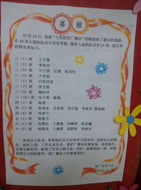现场,49名优秀少先队员仪态大方、亲切自然,用不同方式和风格展现了各自的才能。最终陈骏天等27名同学脱颖而出,正式成为“七色阳光广播站”的队员。
