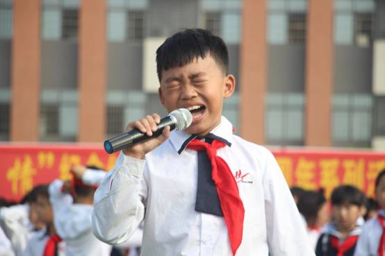 三年级同学向高年级提出挑战,他们激情演唱《没有共产党就没有新中国》和《红星闪闪》两首歌曲,以激昂、动听的歌声瞬间感染了所有在场人员的情绪,很多会唱的同学也都不自觉地跟着唱了起来。