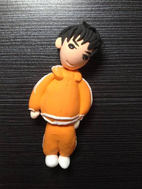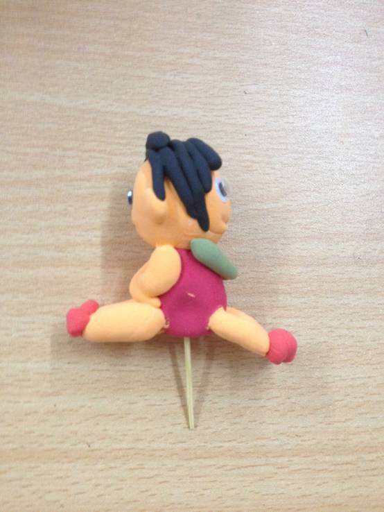 小泥人的头部概括成一个圆球或着椭圆,再搓圆摁一下,用小工具切一下,添上眼睛和眉毛;身体概括成一个水滴形,加上细细的圆柱形做腿和手。