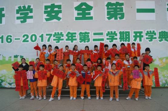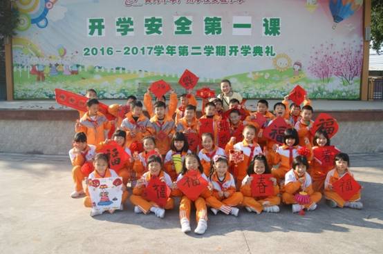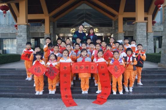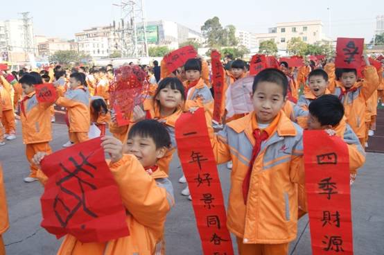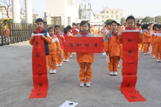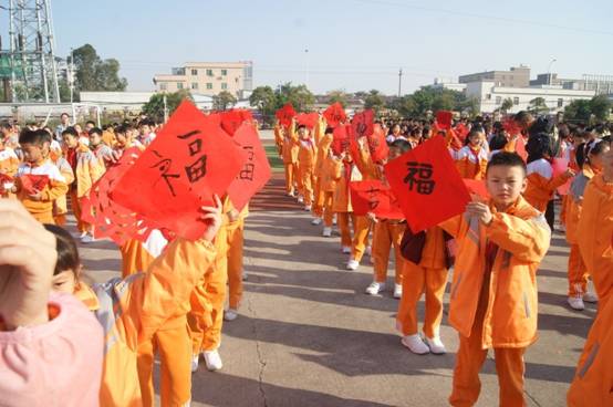 在热情洋溢的拜年歌舞声中,全校孩子挥舞着假期精心制作的春联、灯笼、福字……操场上一片喜气洋洋。