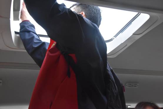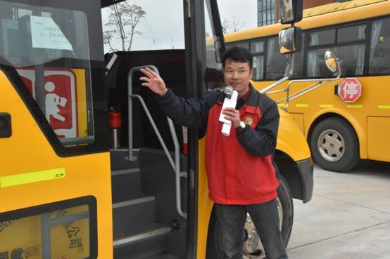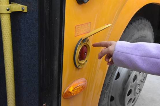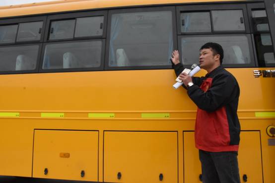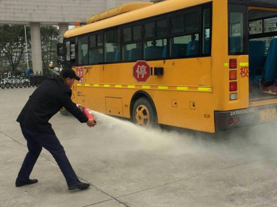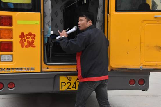 演习活动中,校车公司专职安全员向所有司乘人员(校巴司机、随车教师、乘车学生)详细介绍灭火器及破拆锤的使用,以及应急门和天窗开启方法,并指导司机、随车教师基本应急避险能力。