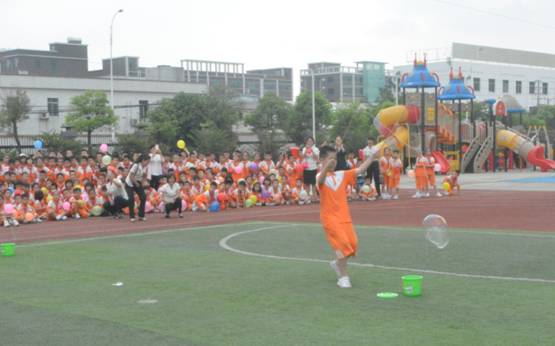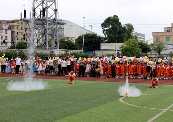 4位火箭手上场,只见他们拉燃引绳,4支火箭冲天而起,然后在空中打开,形成美丽的降落伞,缓缓落下,其蕴含了气压原理,使孩子们对气压科学原理有了更为形象的认识。
