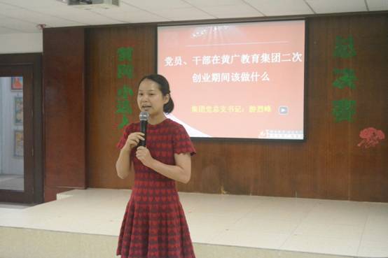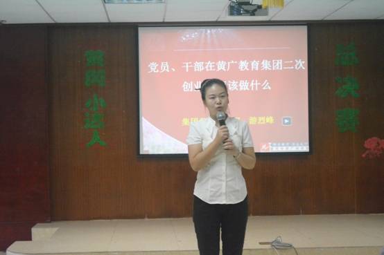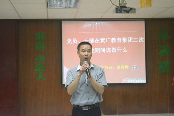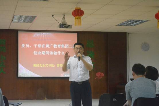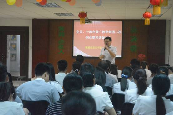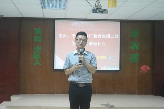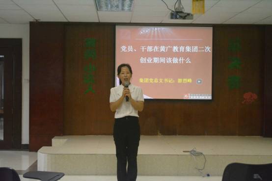 广州市黄广中学创办人、党总支书记游烈峰出席本次会议,并作《党员、干部在黄广教育集团二次创业期间该做什么?》的主题报告。