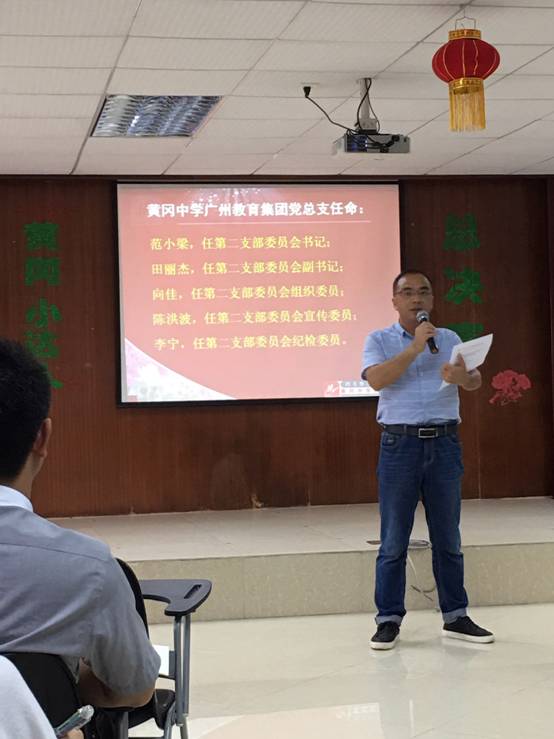 ▲广州市黄广中学党总支黎强组织委员宣读党支部批复意见,并任命支部委员。