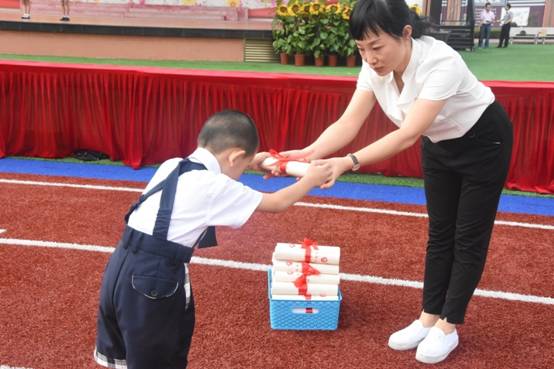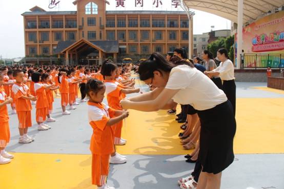 孩子行三鞠躬大礼,老师回礼。教师向学生赠送特别的礼物——《爱的教育·国学经典诵读本》(黄广小学自主研发的国学教材)。