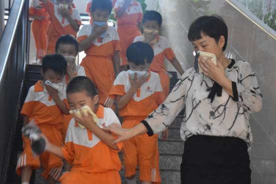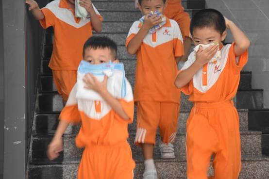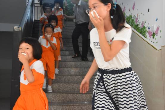 生活老师迅速指挥孩子穿衣,找毛巾捂鼻子,列队,弯腰疾步下楼集合。全体老师、校警在各楼道、路口指挥疏散。