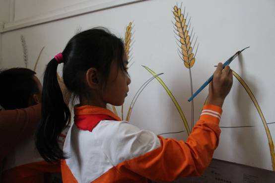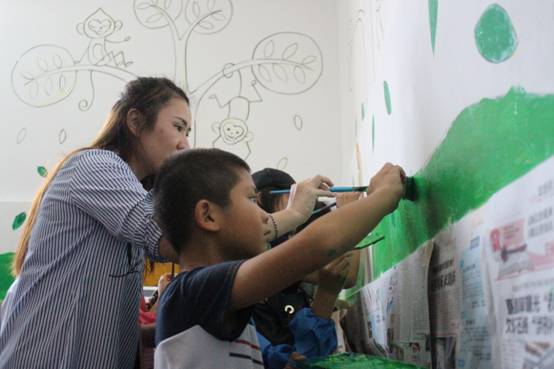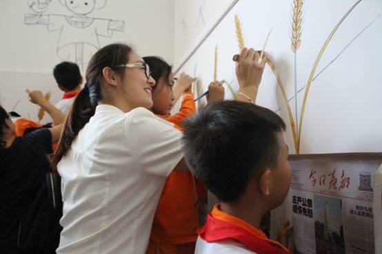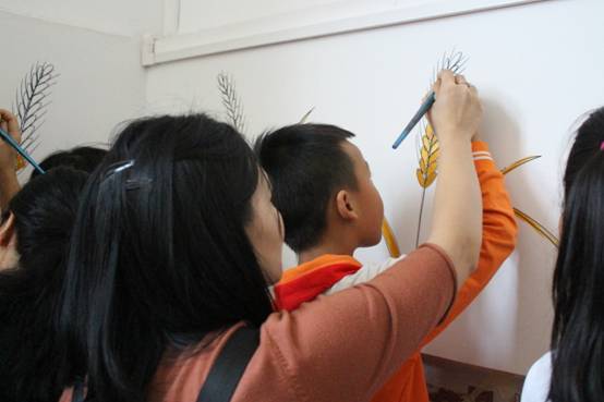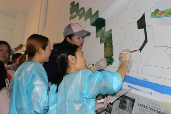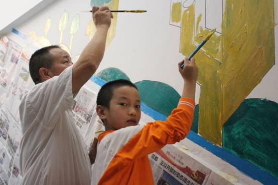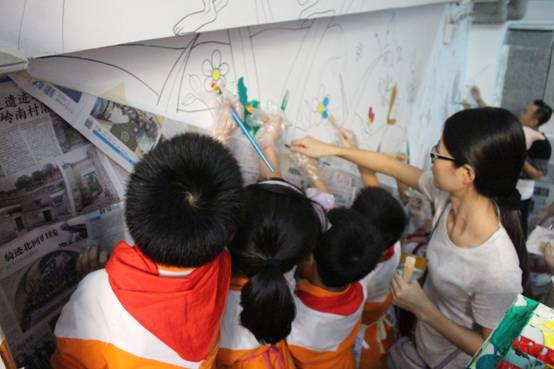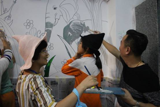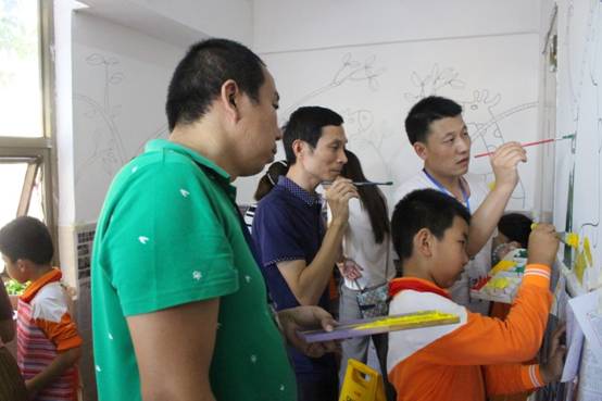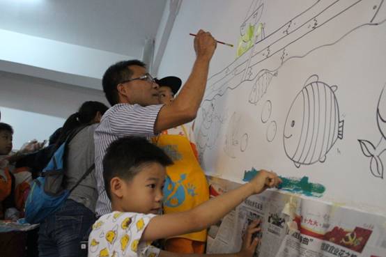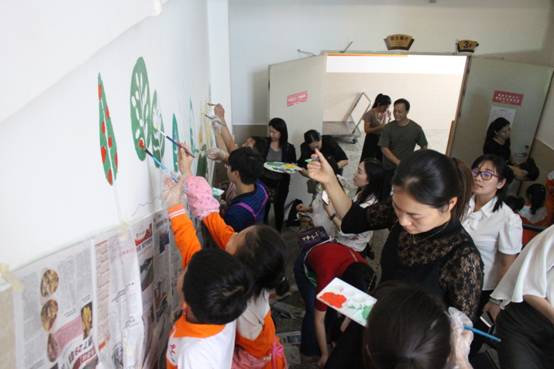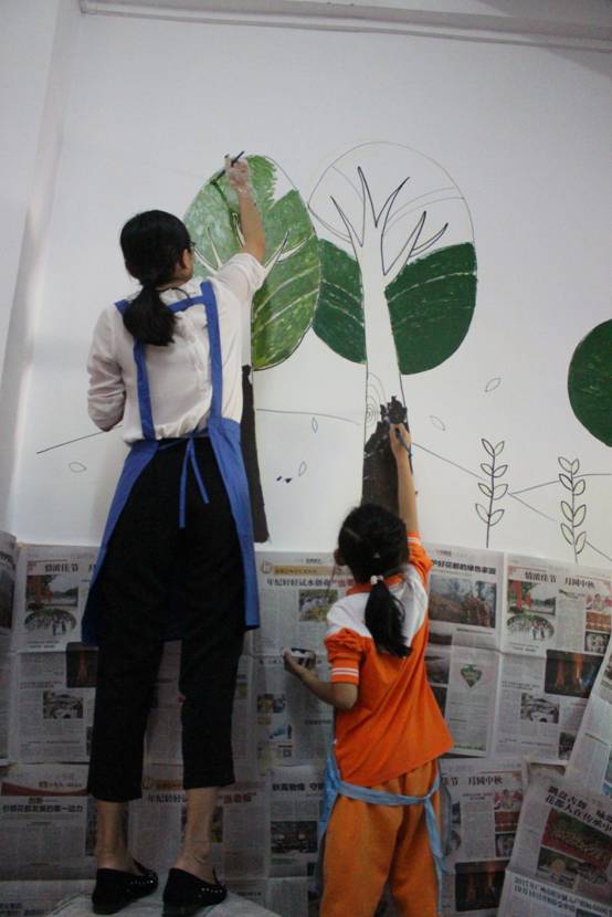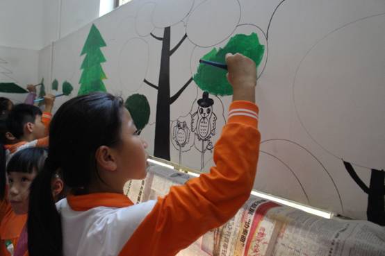 二、三年级300名家长和孩子们大手牵小手,共同将食堂楼道30面白墙壁,变成一幅幅以“森林”为主题的生动画面。
