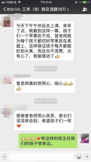 上述照片在不经意间,传到班级微信群内,引发了家长们的倾心感激。感激的不仅是一项切苹果的举动,更是2个月来,家长们感慨曾老师为孩子们倾心付出的点点滴滴。
