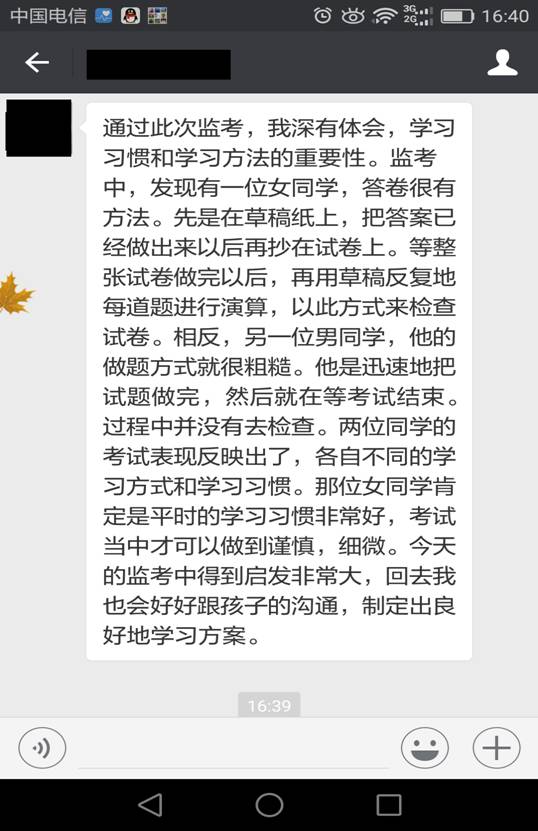 也有细心的家长发现,通过此次监测,对孩子学习习惯和学习方法的重要性深有体会。考场上发现有一位女同学,答卷很有方法,先是在草稿纸上,把答案已经做出来以后再抄在试卷上,等整张试卷做完以后,再用草稿反复地每道题进行演算,以此方式来检查试卷。相反,另一位男同学,他的做题方式就很粗糙。他是迅速地把试题做完,然后就在等考试结束。过程中并没有去检查。