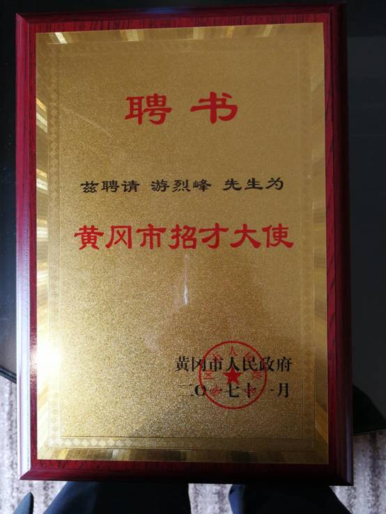 11月12日,游烈峰等四位校友获黄广市人民政府授予“招才大使”荣誉称号。