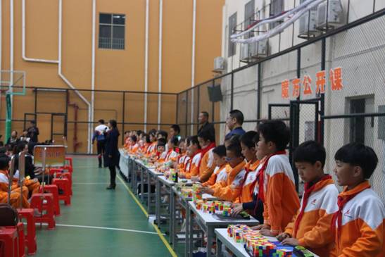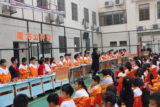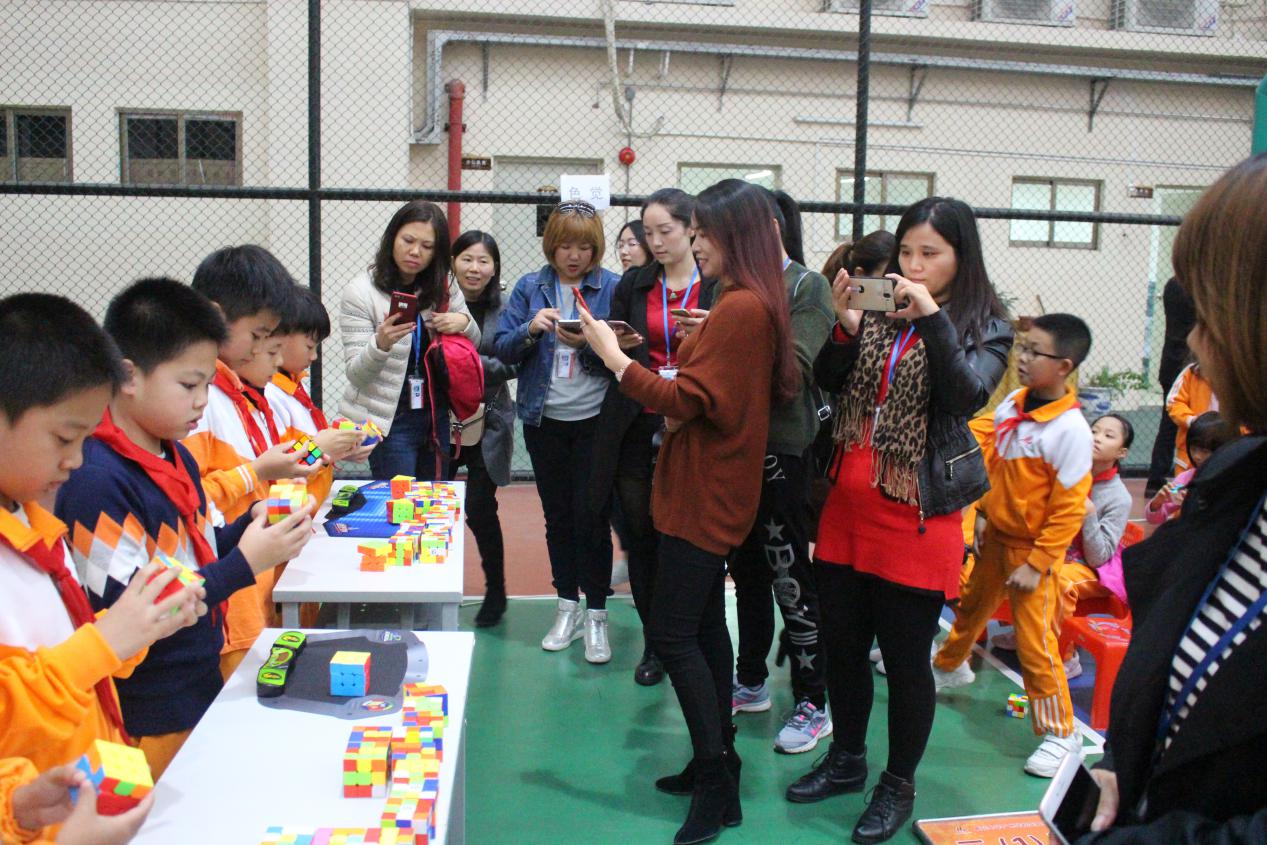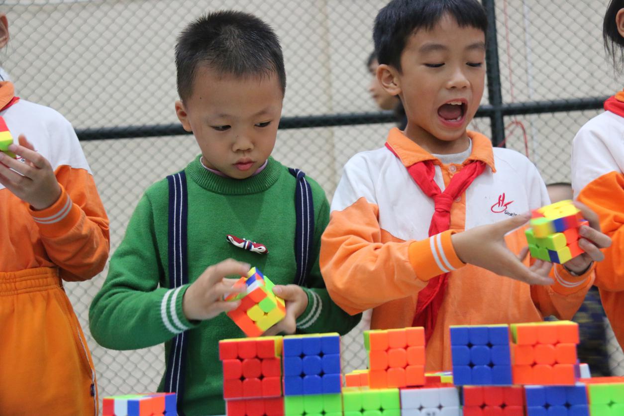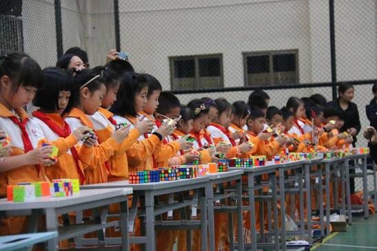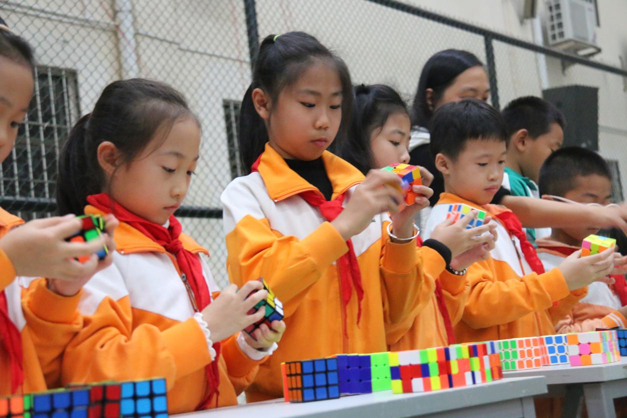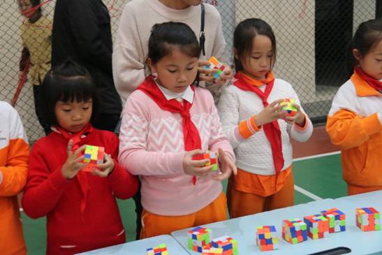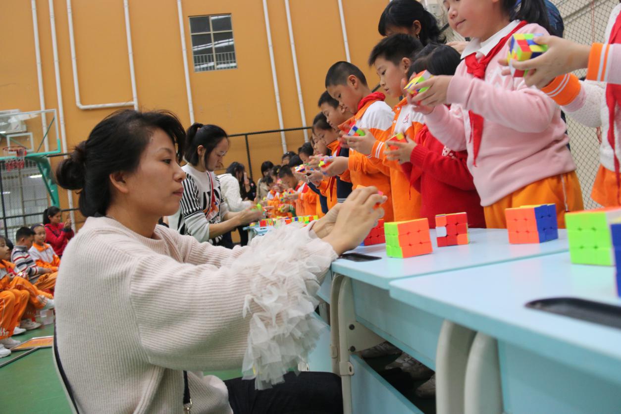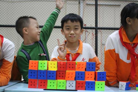 这是黄广小学三年级组魔方特色课程长期坚持的结果。据悉,该年级目前会玩“还原三阶魔方”的学生达到一百多人,可以在一分钟内还原的学生达到80多人,最好成绩达到13左右秒。