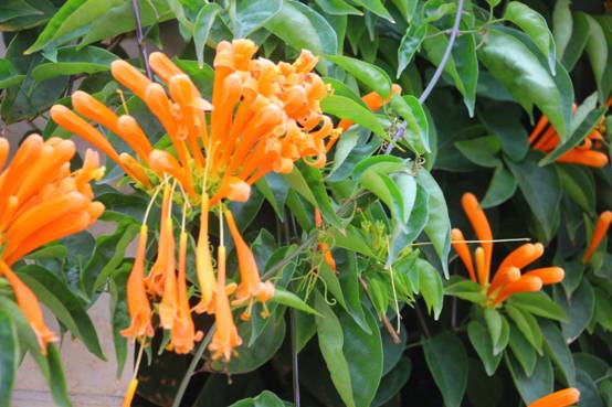 炮仗花花蕾似锦囊,花冠若罄钟,花丝如点绛,色彩橙红,攀爬能力极强,花至盛期极为鲜艳夺目,实在酷似喜庆鞭炮。