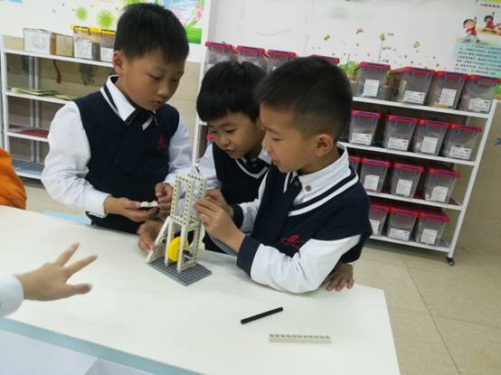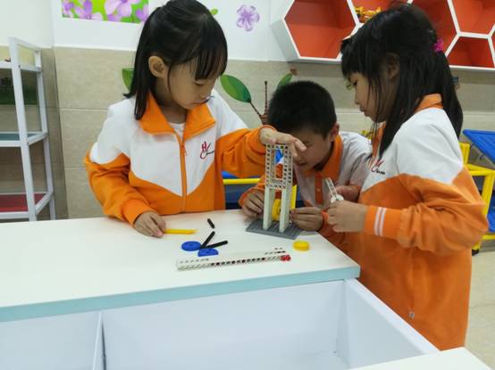 目前,一年级的孩子从学习《玩趣方块》到《力与简单机械》,以积木为主轴,掌握了斜面原理的特点,并知道斜面原理在生活中的应用,还能结合相应的器材搭建出双层斜面模——滑滑梯。