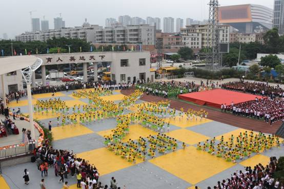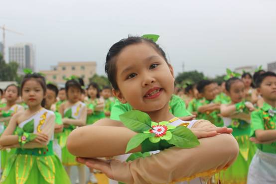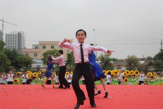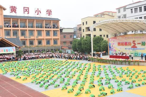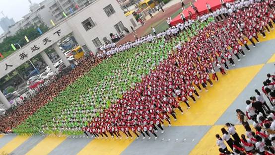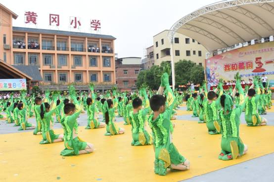 一曲简单明快的《我和黄广一起长大》主题曲拉开序幕,一小时后又再次响彻校园,一起一收,一呼一应,一唱一吟,不仅唱出孩子们“生如夏花”的梦想,更让大型团体操表演形成一幅完美的画卷,让放飞歌声与仰望梦想完美融合。