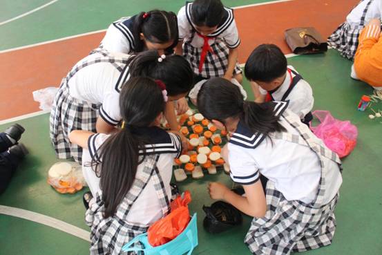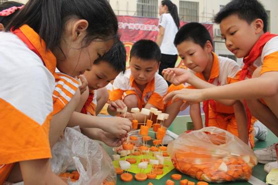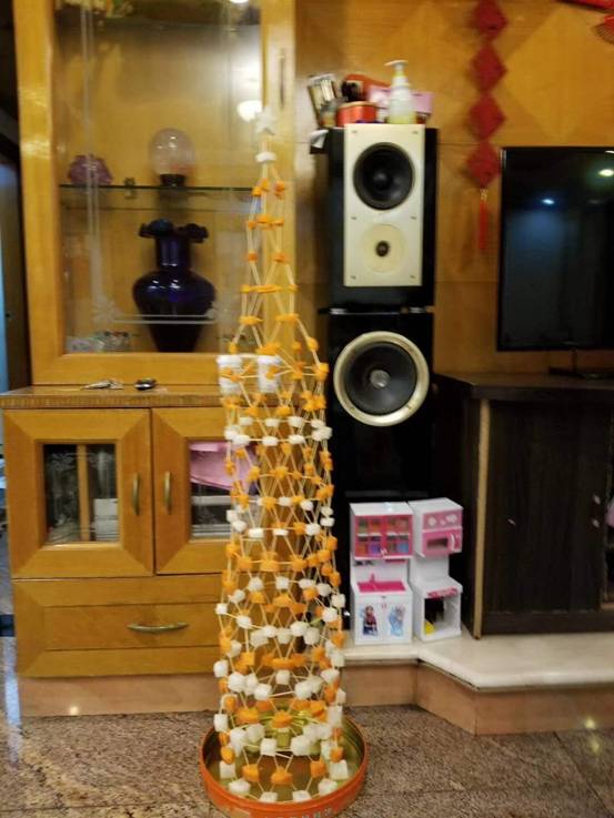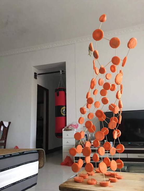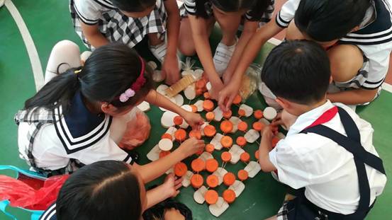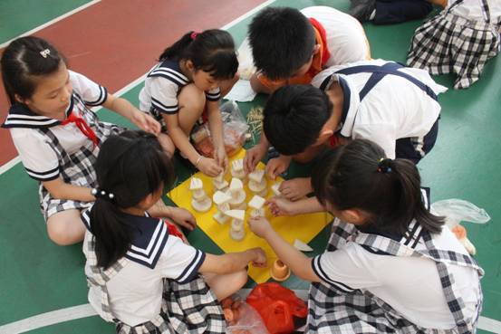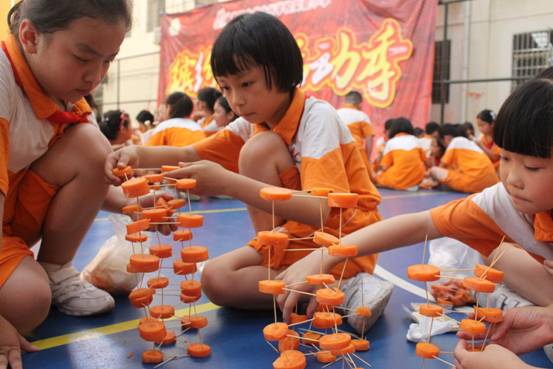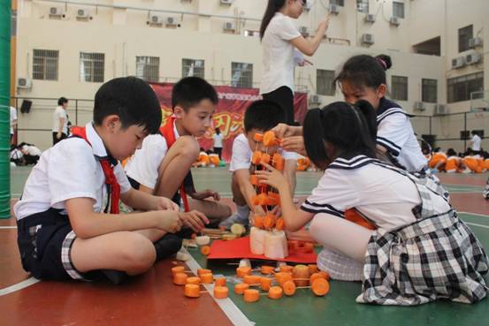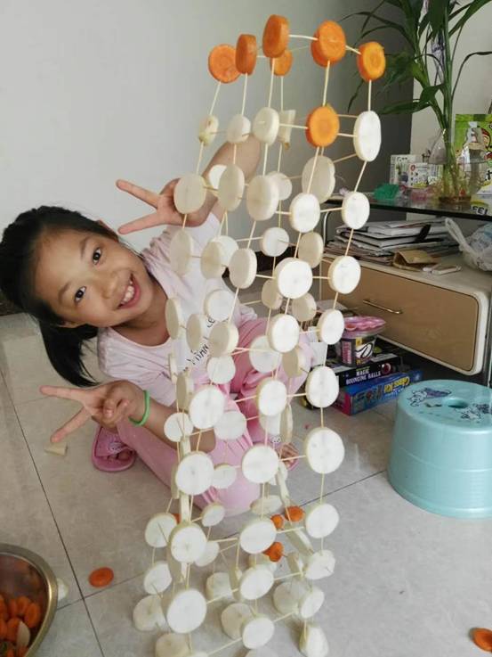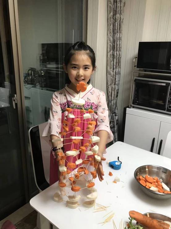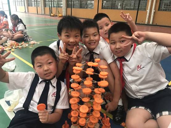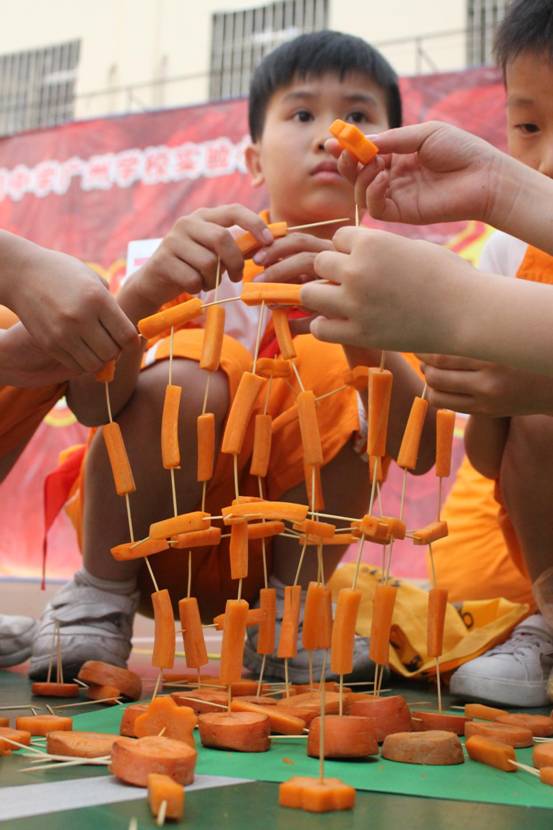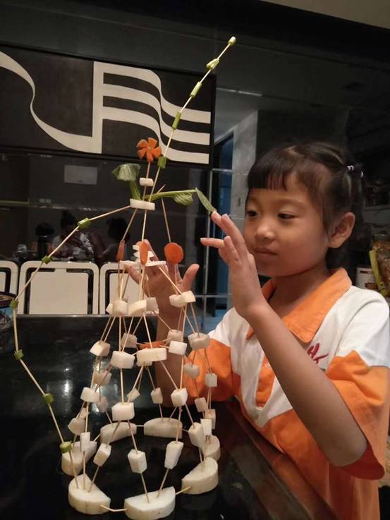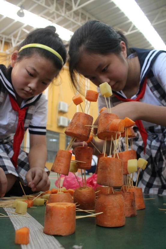 每班5个小组,要求孩子在规定的时间内,利用牙签、土豆、萝卜等动手现场搭建一件塔体艺术品,以搭建塔的高度、结构创意、结构难度、结构搭配、时间与纪律、场地卫生等各方面综合评价出优秀作品。