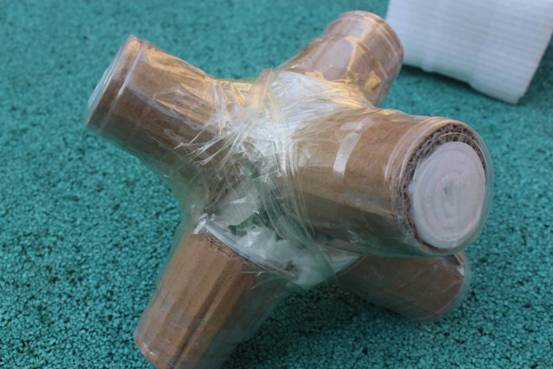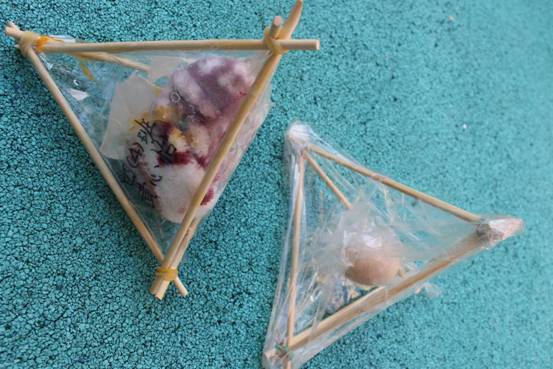也有吸管组合型,用很多吸管绑在一起做成吸管组,将吸管组搭成金字塔形,将鸡蛋夹在中间,用胶条固定,利用吸管的中空,超到缓冲作用。