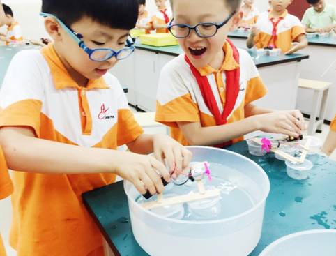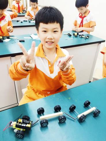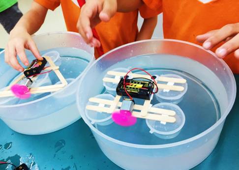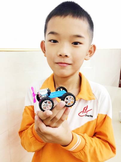 可不是嘛,这群一二年级的小孩子呀,早就知道了怎么用磁铁做一辆磁力小车、怎么用螺旋桨做一台风力小船、怎么用小马达和小刷子做一个清洁小机器人……