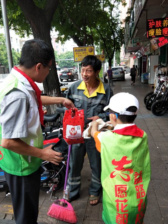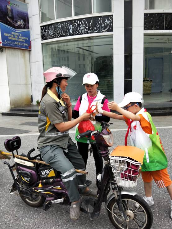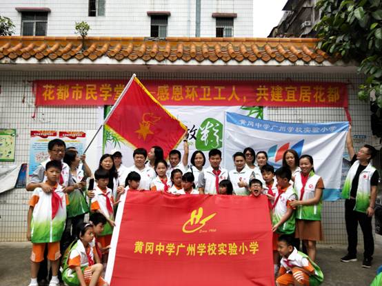 6月16日,端午节前夕,金彩汇1068(黄广教育集团成员学校,简称黄广小学)少先队“智慧大队”联合花都区志愿者协会,辅导员及队员代表、家长代表等一行,持续三个小时,走街串巷,沿路向花都“城市美容师”——环卫工人送节日礼物粽子和夏日消暑饮料王老吉,向他们致以崇高的敬意和节日问候。