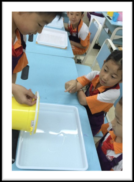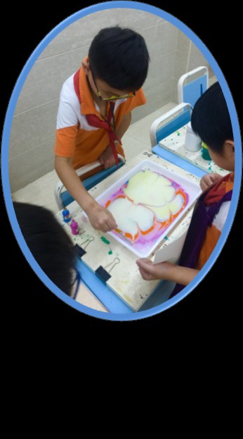 用塑料棍轻轻搅动水中的颜料。