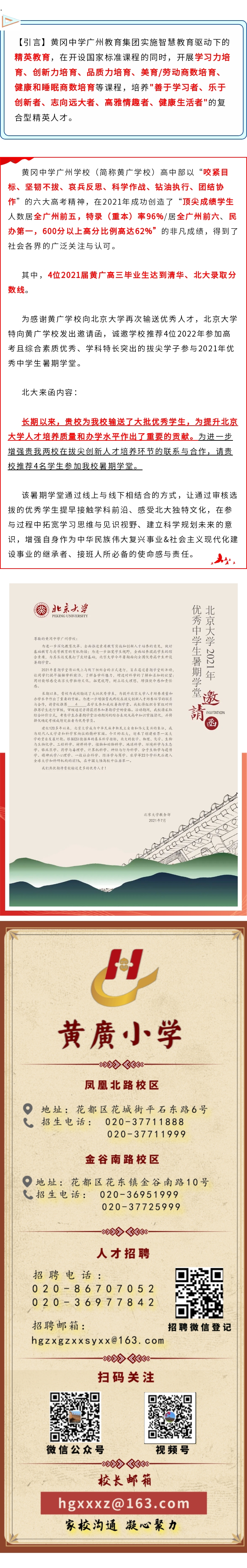 > 【来自北大的邀请函】黄广学校办学能力获北大高度肯定,4位学子受邀参加“北大2021年优秀中学生暑期学堂”