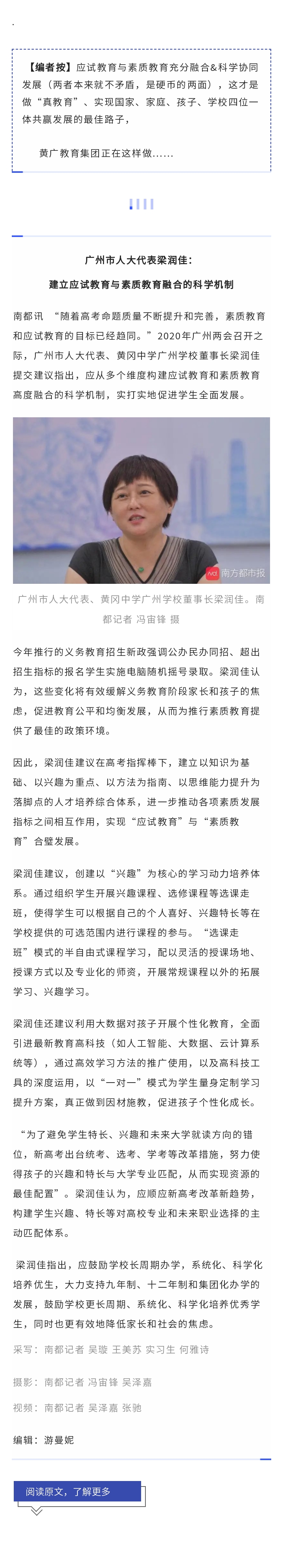 > 【南方都市报】广州市人大代表/黄广教育集团董事长梁润佳:建立应试教育与素质教育融合的科学机制培养优秀人才