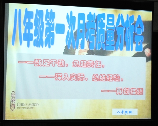 这次月考质量分析会,气氛和谐,节奏明快,是一次鼓舞斗志的会议。它预示着我们八年级组在接下来的时间里将再接再厉,再创佳绩。、
