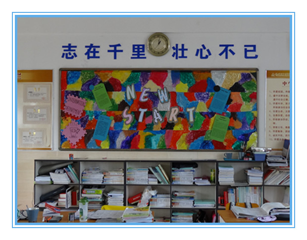 由孙景泉和陈丹同学合力设计,几乎全班同学参与涂抹的板报给课室增添了一道亮彩。