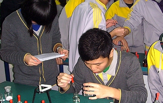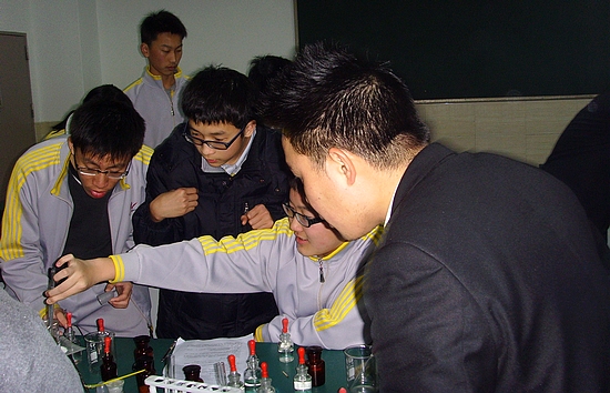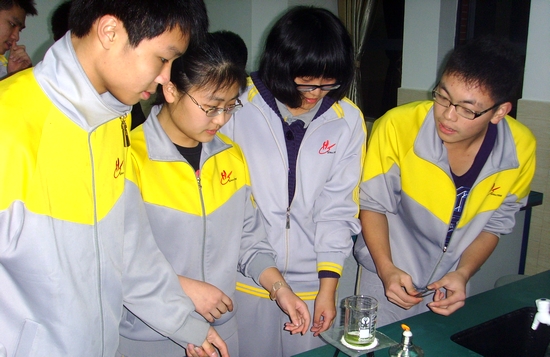2012年3月14日晚,国际部高一班的趣味化学实验活动如期举行。此次活动,同学们利用化学实验室丰富的资源,在化学老师张仁发的指导下顺利完成。