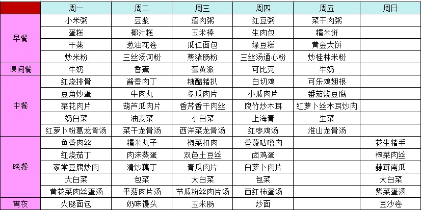 2013学年第一学期第六周菜谱