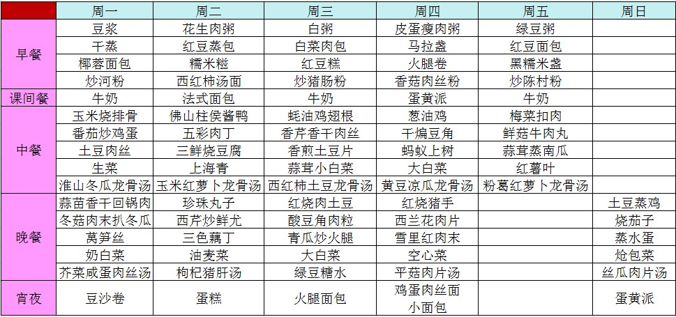 2013学年第一学期第七周菜谱
