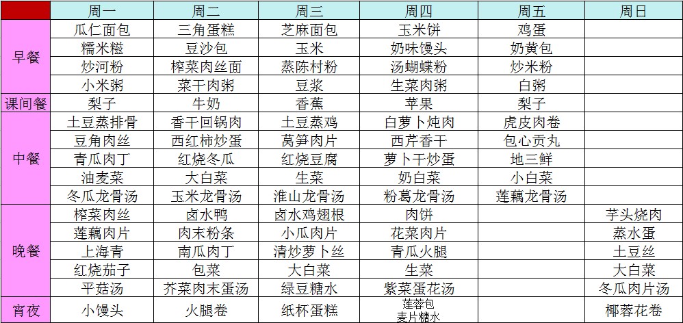 2013学年第二学期第四周菜谱