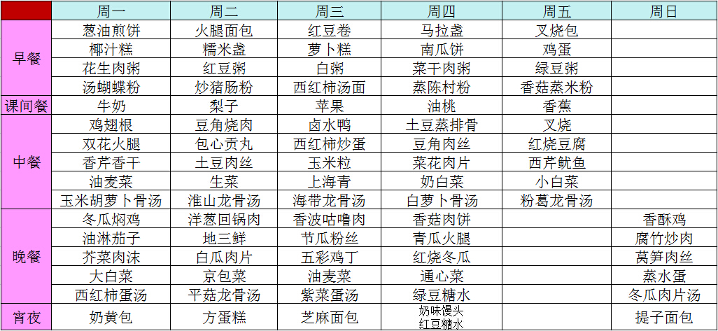 2014年秋季第一周菜谱