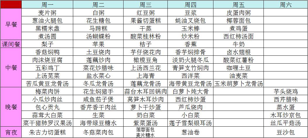 2014年秋季第十三周菜谱