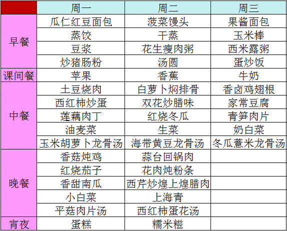 2014年秋季第十八周菜谱