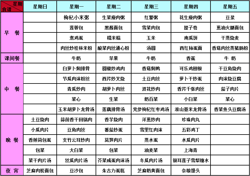 2016年秋季第十五周菜谱