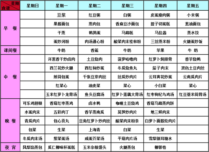 2016年秋季第十八周菜谱