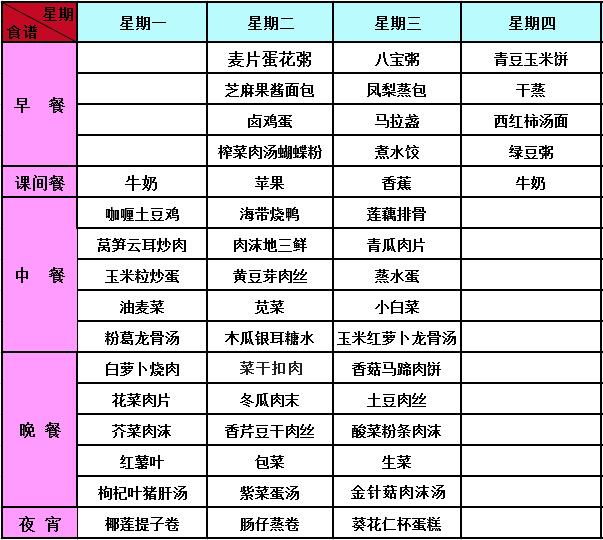 黄广小学2017-2018学年上学期幼小衔接活动周营养菜谱