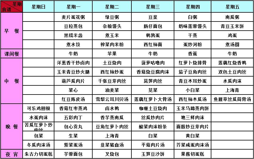 2018年春季第18周菜谱